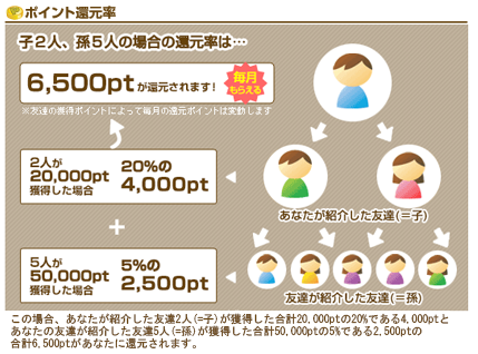 さらに紹介した人が誰かを紹介すると、その人がもらったポイントの最大12.5%がもらえます